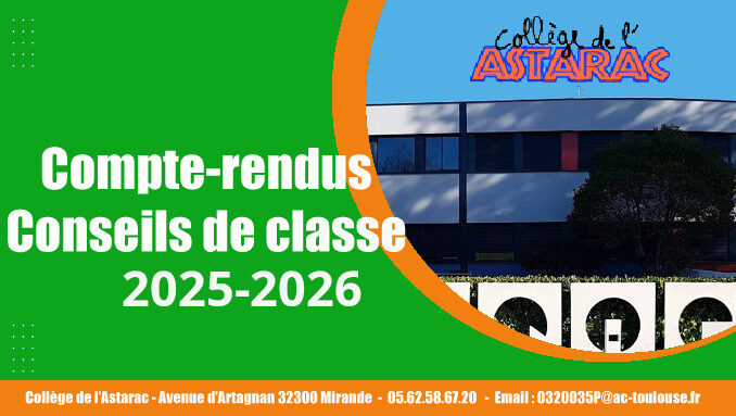 Par Patricia Manseau, publié le mardi 23 décembre 2025 11:57 - Mis à jour le mardi 23 décembre 2025 11:57Veuillez trouver les comptes rendus des représentants de parents d'élèves aux conseils de classes de 4ème ainsi que les appréciations des professeurs sur le groupe classe pour le 1er trimestre 2025 - 2026 -