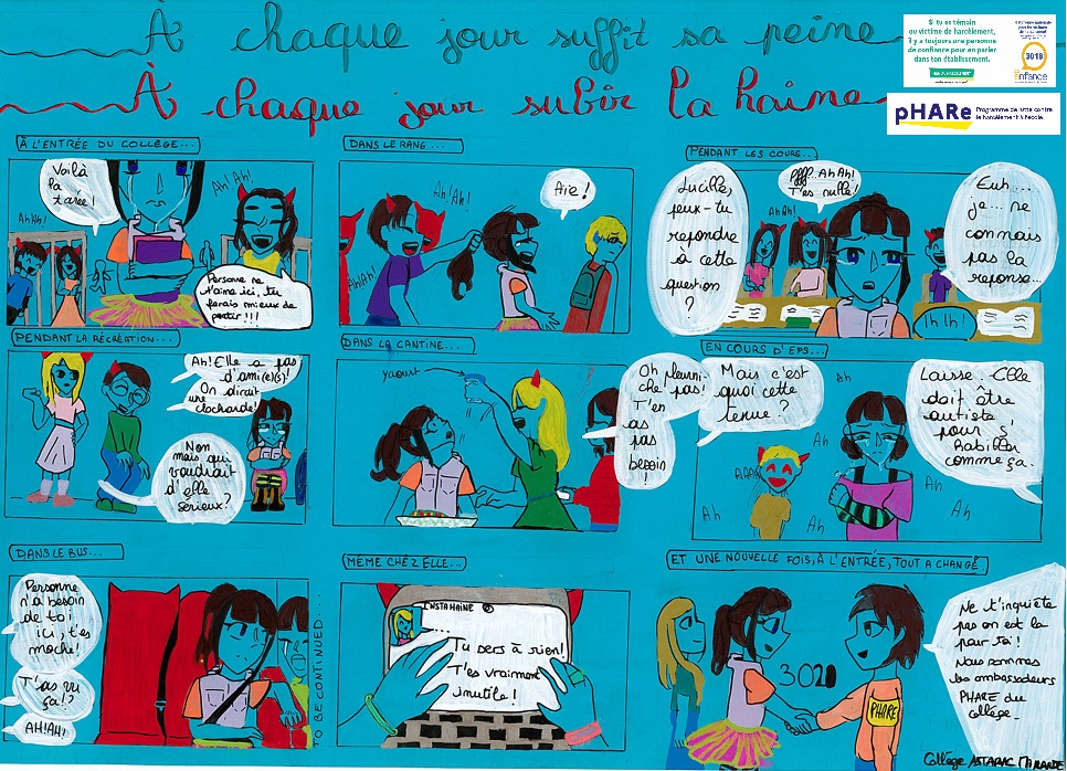 Cette affiche réalisée par les ambassadeurs Phare, ayant nécessité plus de trois semaines de travail, entre l’élaboration de la trame et la réalisation des dessins. Le sujet abordé est le harcèlement systémique